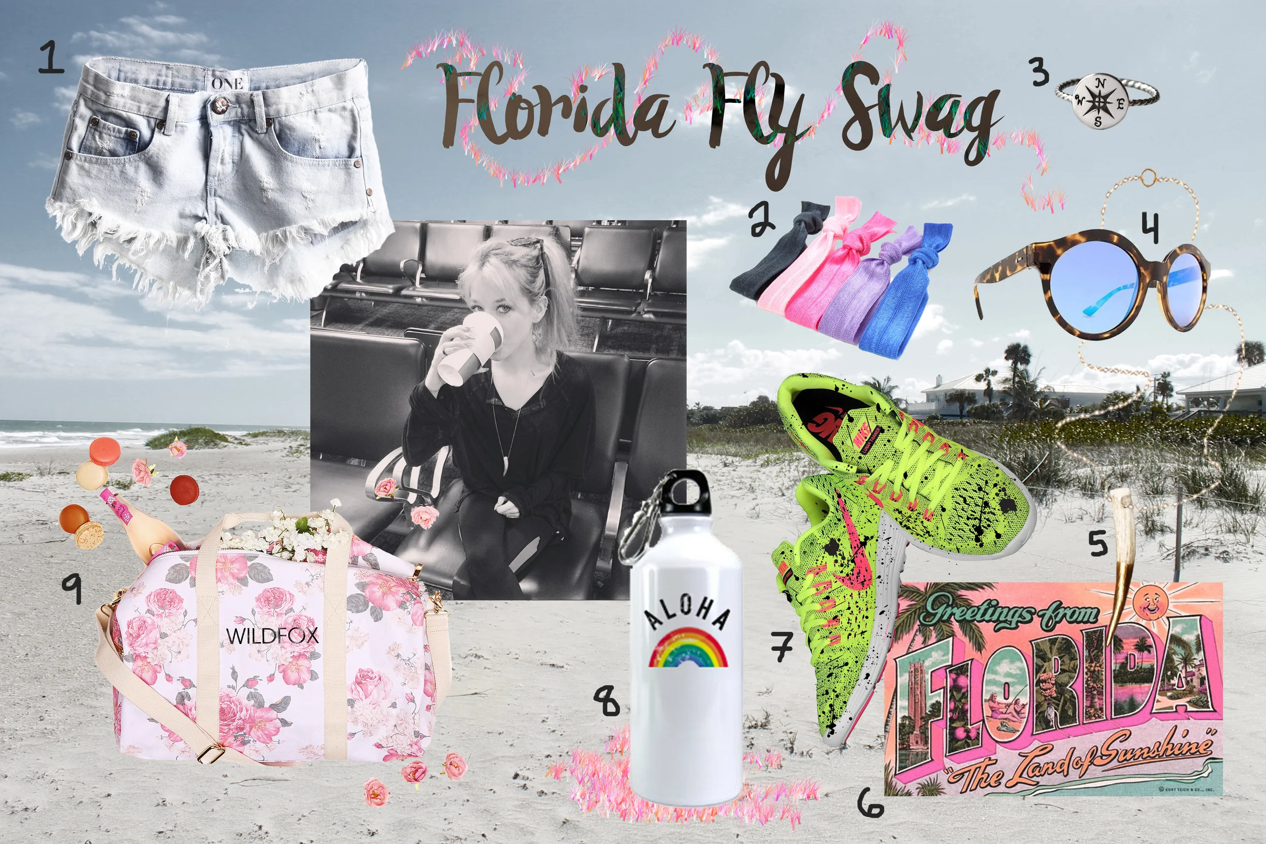 1. One Teaspoon Bonitas, perfect summer vibe shorts. 2. Colorful hair bands, better than regular hair ties. 3. Compass Ring, I’ve been wearing this almost everyday since I ordered it from Etsy a year ago, helps me to find my grounding when I’m lost away in my mind. 4. Dot Dash Blue Tortoise Sunnies, snagged in Hawaii, sold to a random guy in Florida for 4X the price. No Joke. #Swag. 5. Gold Tip Antler Necklace, also one of my staple jewelry pieces over the last year. 6. Greetings from Florida! I love to collect and send post cards while I travel, it’s a timeless fun souvenir to send in the mail. 7. Nike Lunarlons, these are my everything workout/active shoes, I custom splatter painted them with some black liquid acrylic to make them extra Alyssa. 8. Aloha Water Bottle from Urban Outfitters in Honolulu, super useful and such a great buy for yoga and travel and everyone drinking water ever. 9. Wildfox Gym Bag, I use this bag everyday as a laptop/camera/work stuff bag, it fits everything I need for being productive on a daily basis, and it’s super cute.